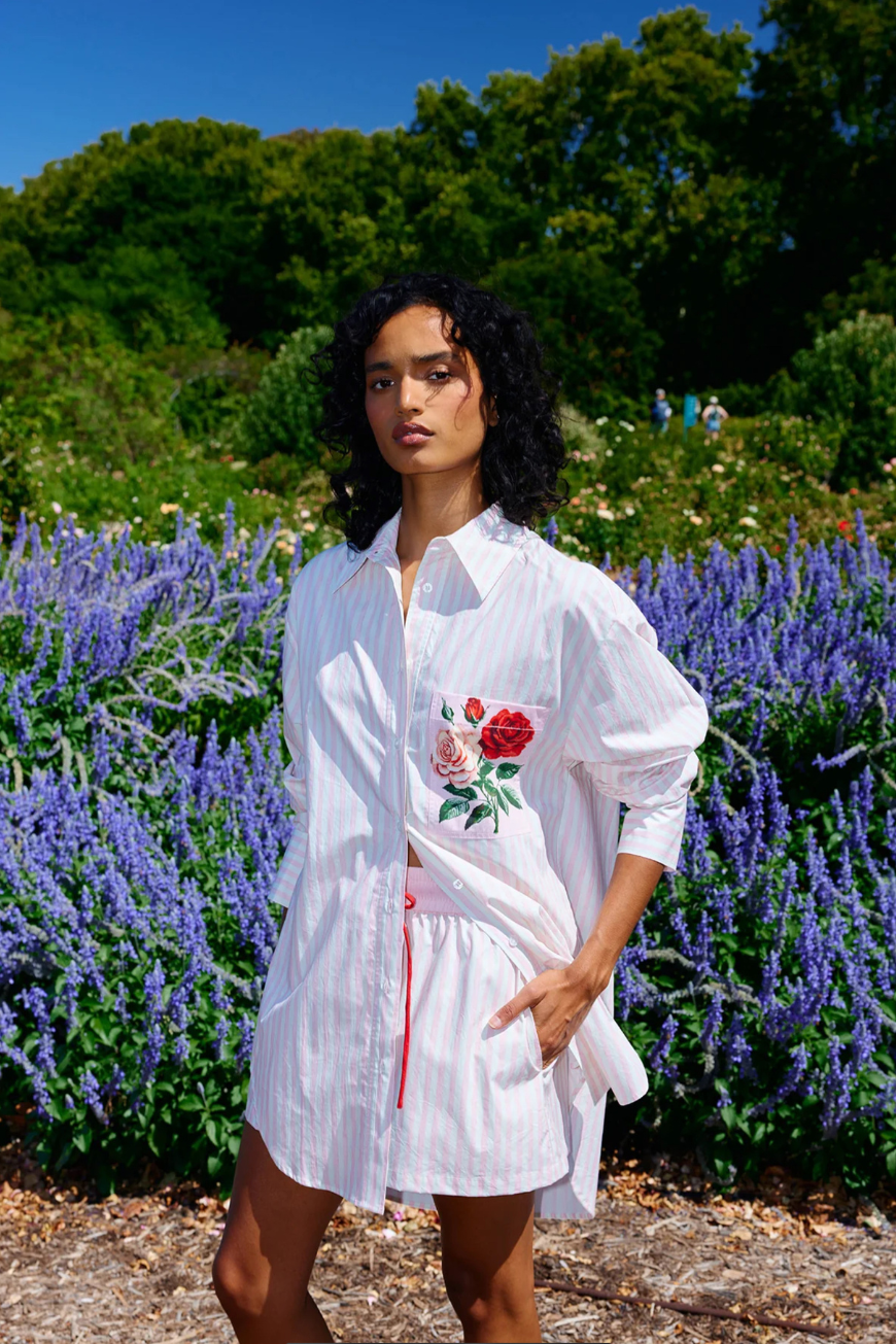 Our signature Buddy Shirt is reimagined in a soft Baby Stripe, with a rose placement print pocket detail. With a relaxed silhouette and long sleeves, the Buddy is a versatile staple that seamlessly enhances any look.