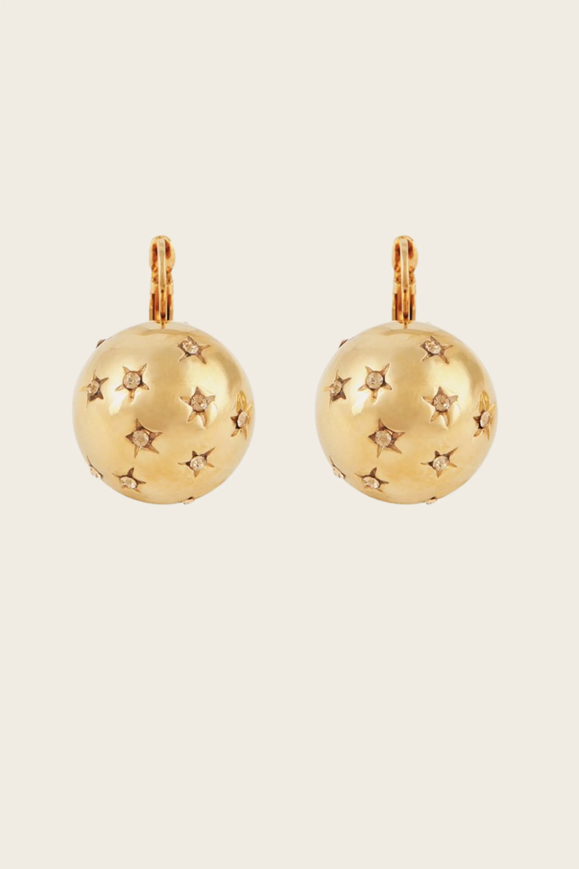 - Design: Round comet-inspired earrings with radiant strass detailing