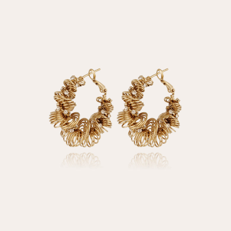Earrings formed from swirls of fine metal wire, gold-plated with fine gold and adorned with rhinestones.
