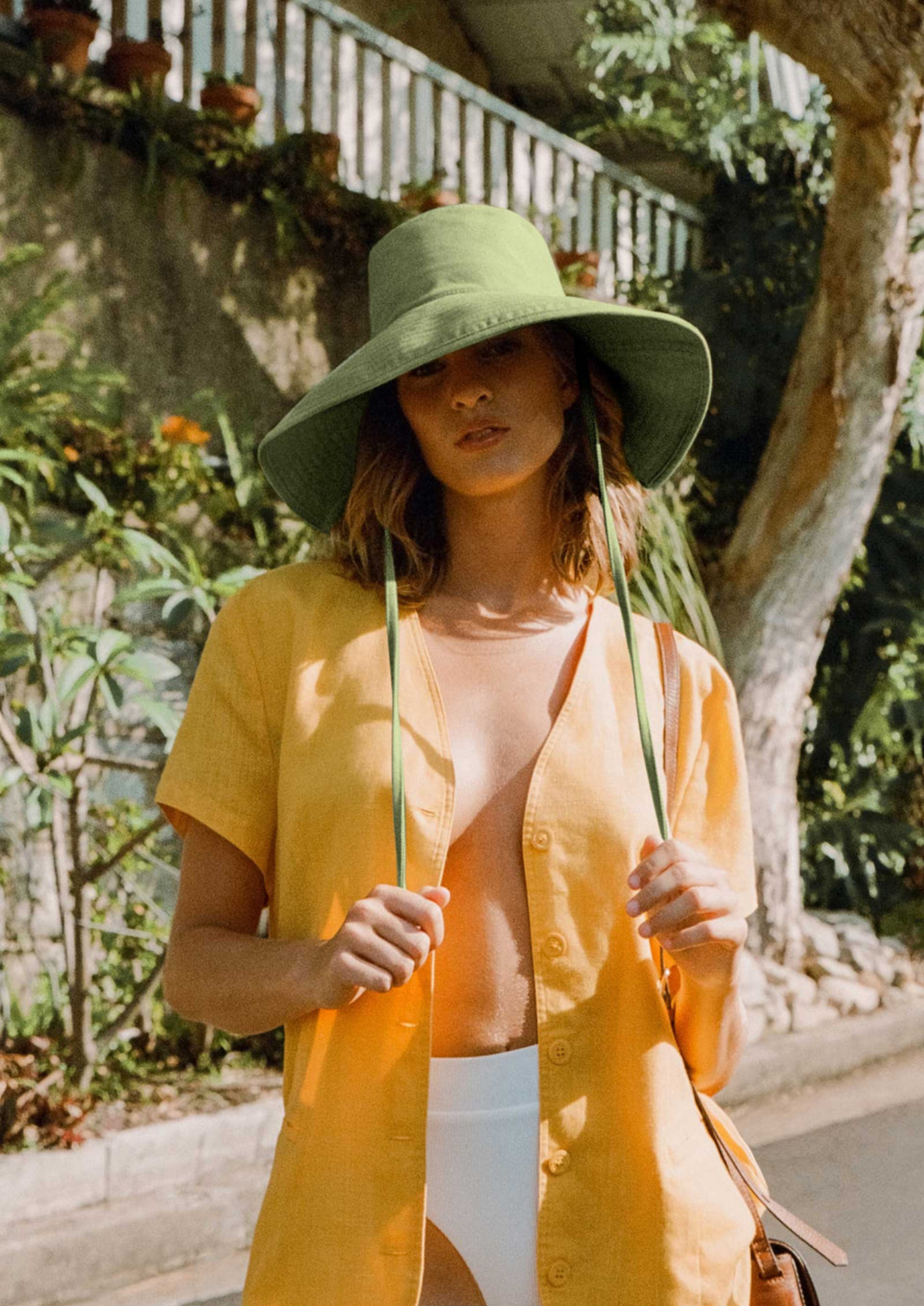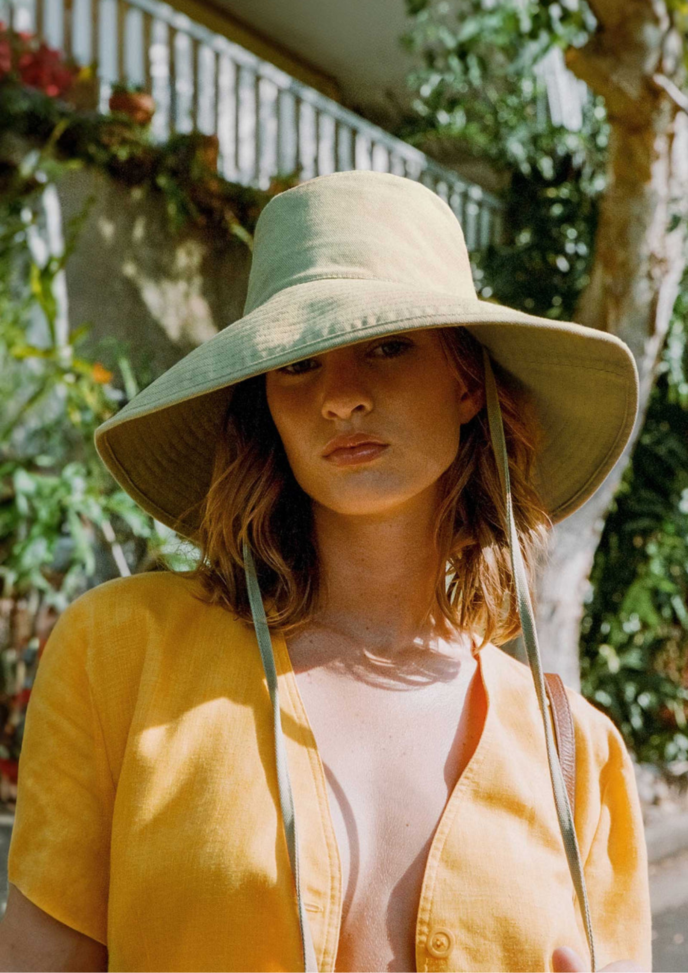 - Description - Made from 100% cotton canvas in cool Pistachio Green colour, our wide-brimmed holiday bucket offers UPF50+ protection. Finished with a simple and secure necktie, ensuring this hat goes everywhere you do.