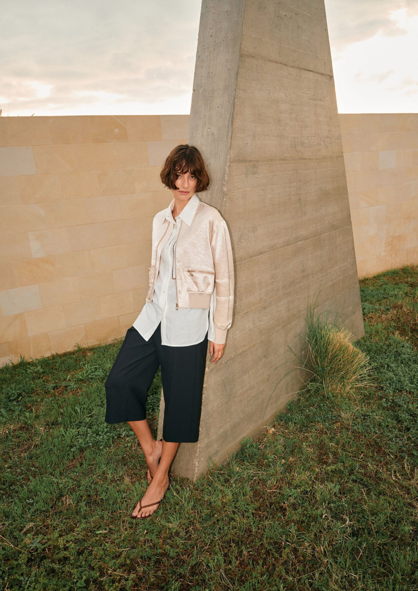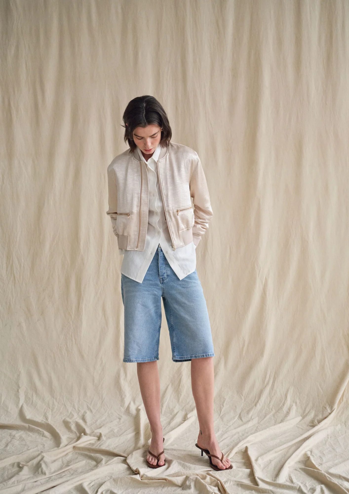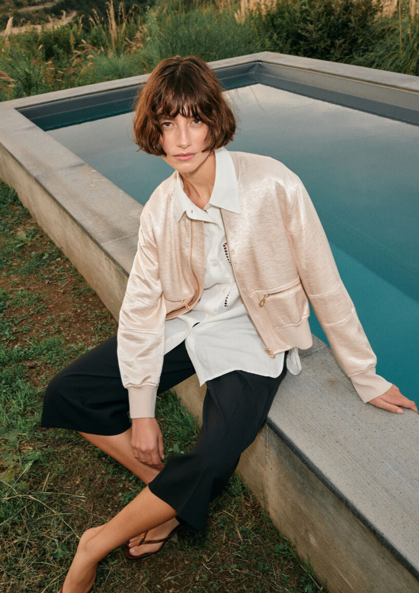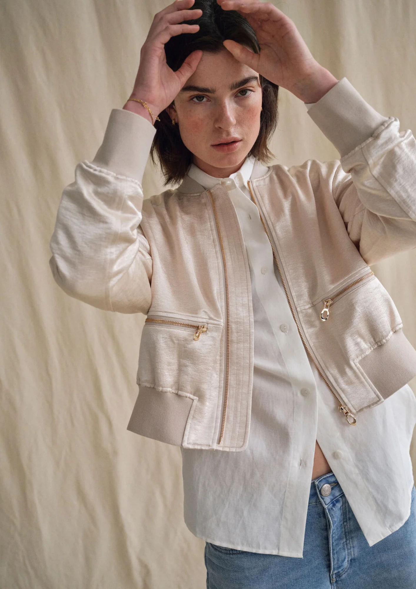 Elevate your outfit with a chic blend of sporty and glamorous vibes with this eye-catching satin bomber jacket. Designed in a slightly loose silhouette, it exudes effortless cool while offering a comfortable fit. The ribbed hem, cuffs, and neckline add classic athletic charm, while the luxurious gold zipper elevates the look. Side slits introduce a modern twist to the timeless bomber design, adding a sense of movement and freshness. Perfectly versatile, style it with wide-leg denim shorts for a laid-back vibe or layer it over a simple dress for a more refined yet edgy ensemble.