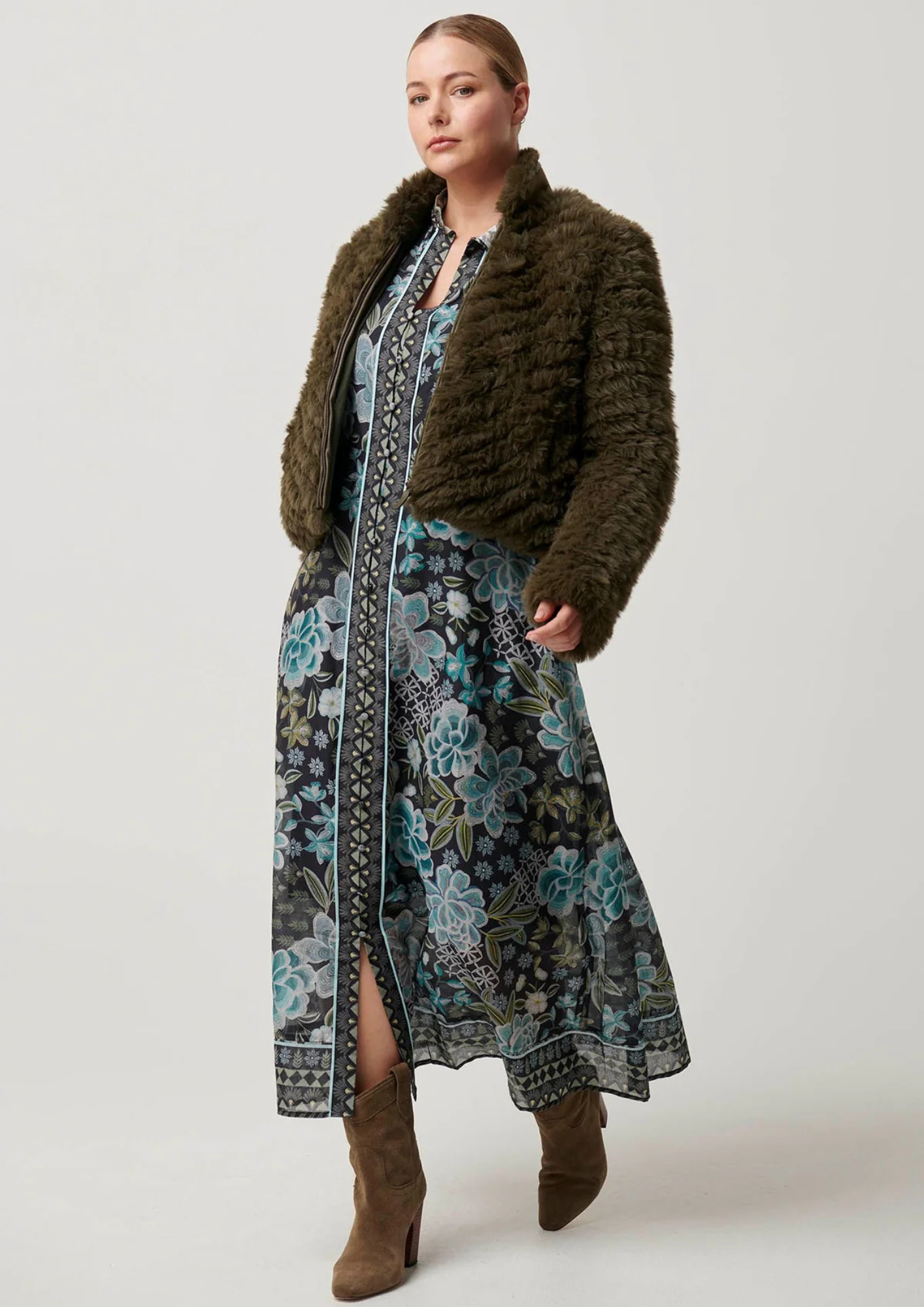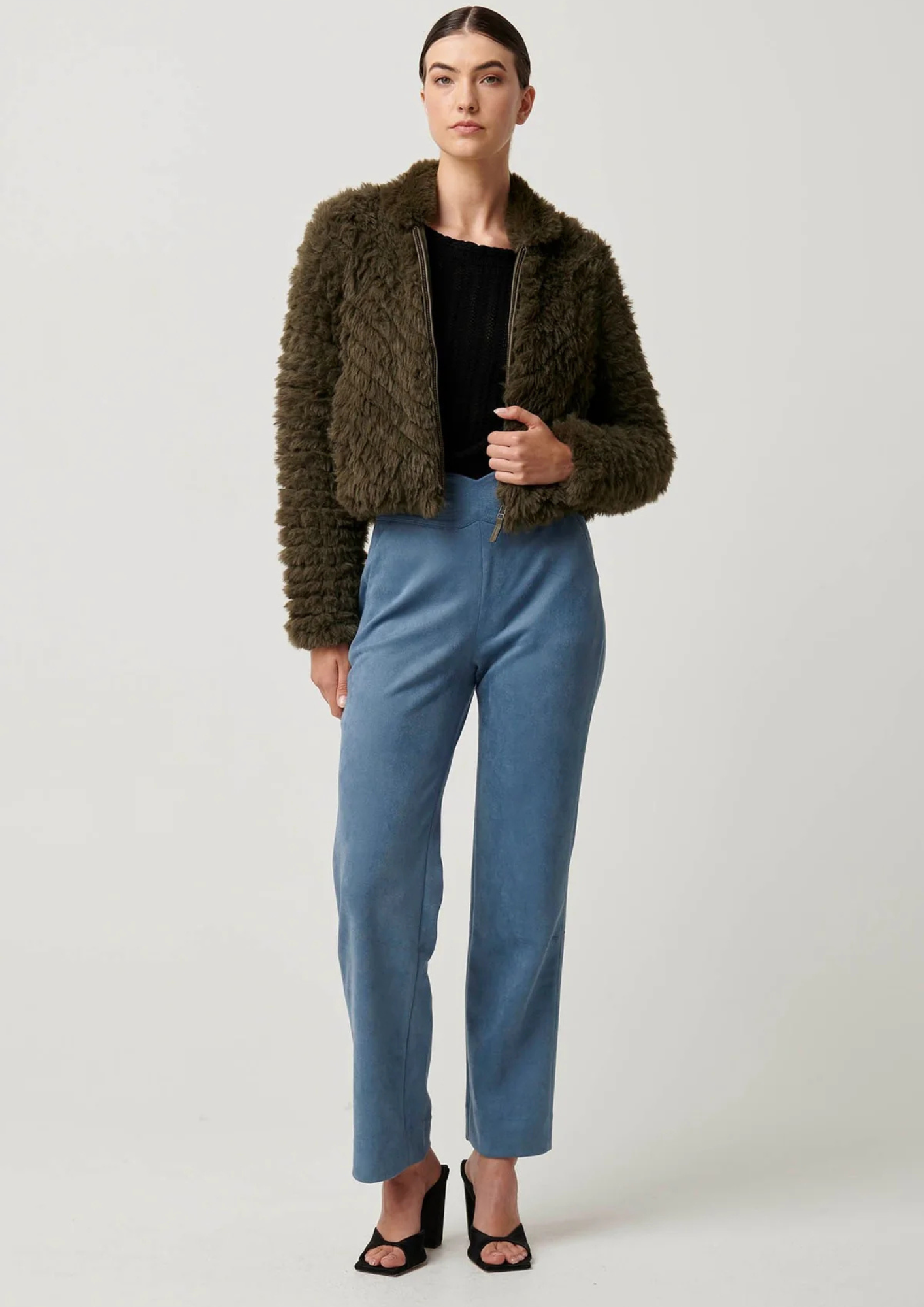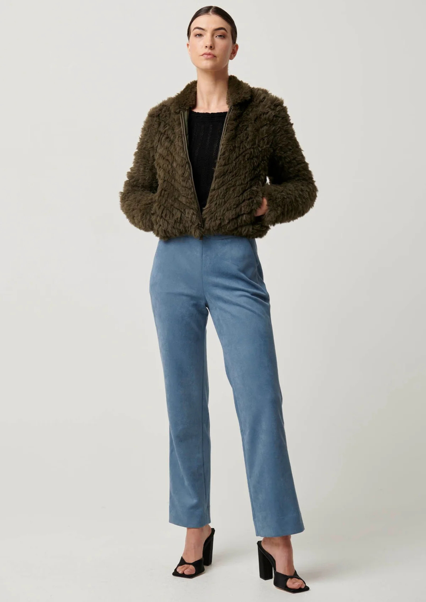 Wrap yourself in luxurious warmth with the Sybil Chevron Faux Fur Rib Collar Bomber in Moss. This stunning jacket combines cozy texture with an effortlessly chic design, making it a must-have for cooler days. Crafted from premium chevron-patterned faux fur, it offers a plush and sophisticated look without compromising on comfort.