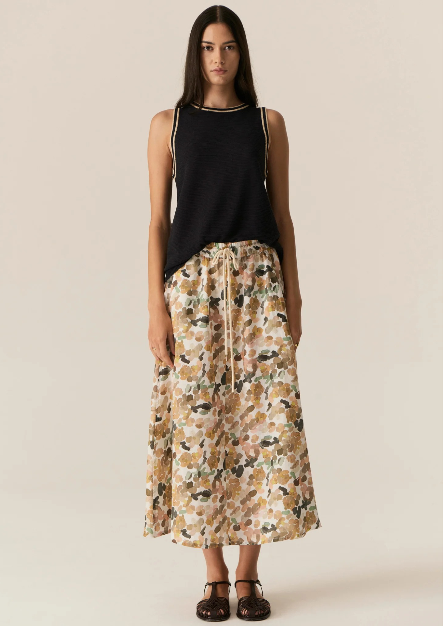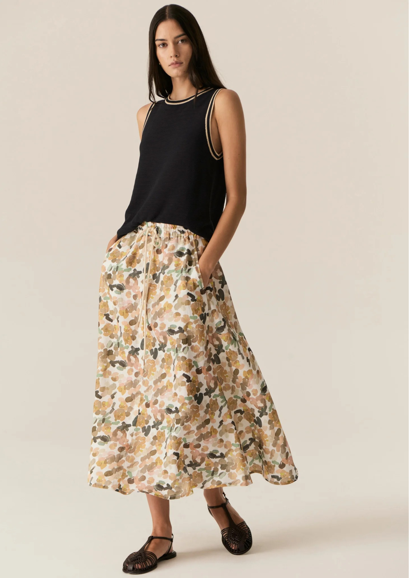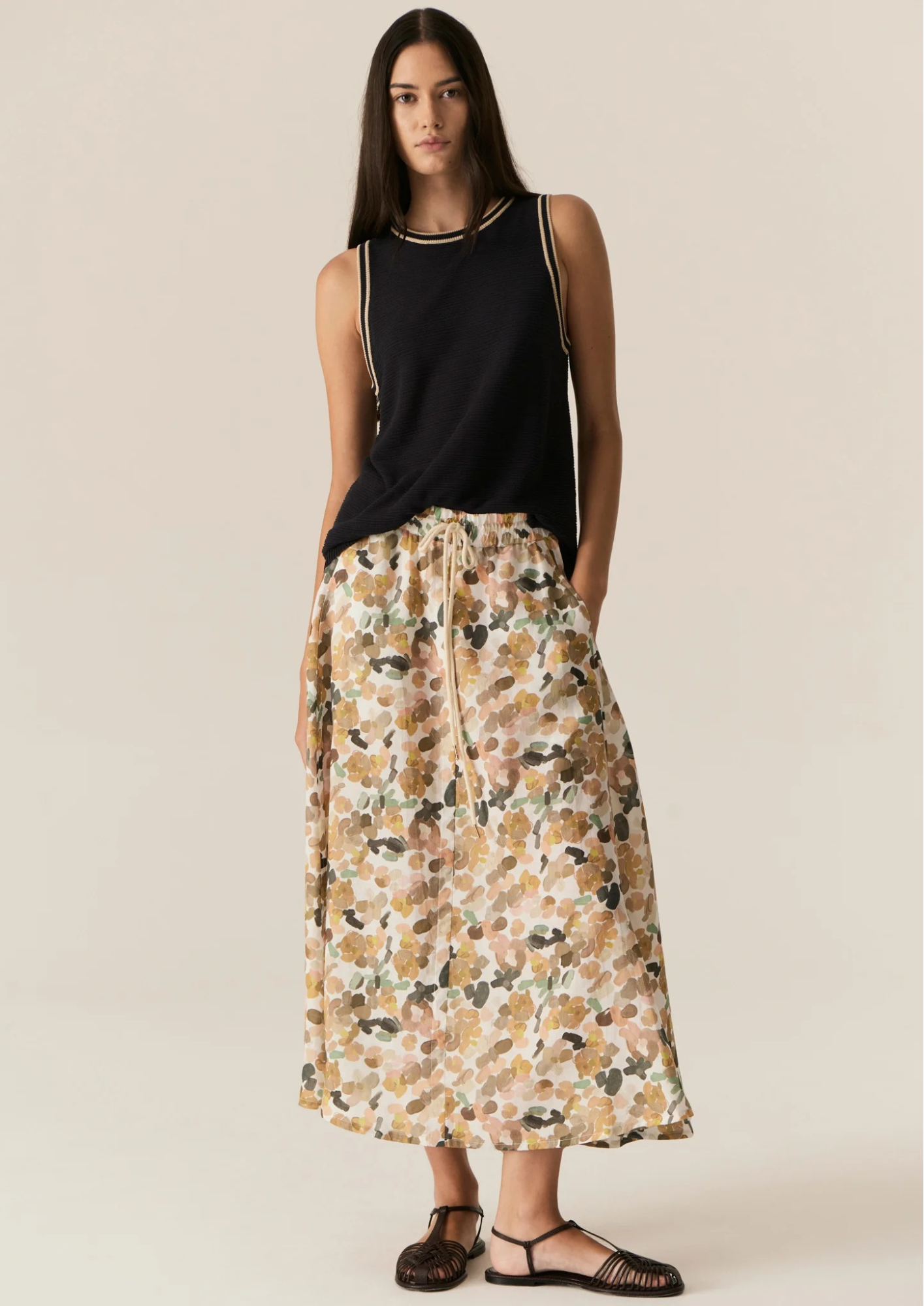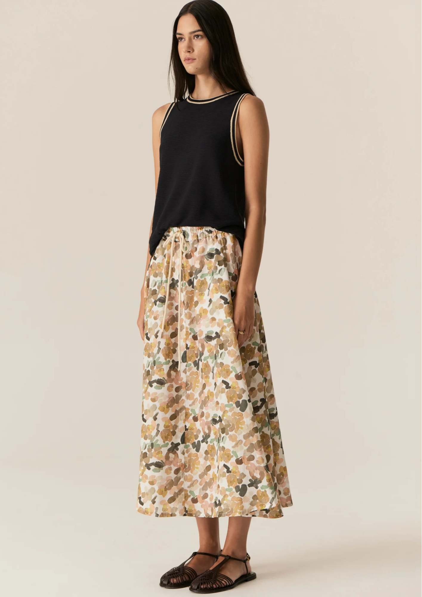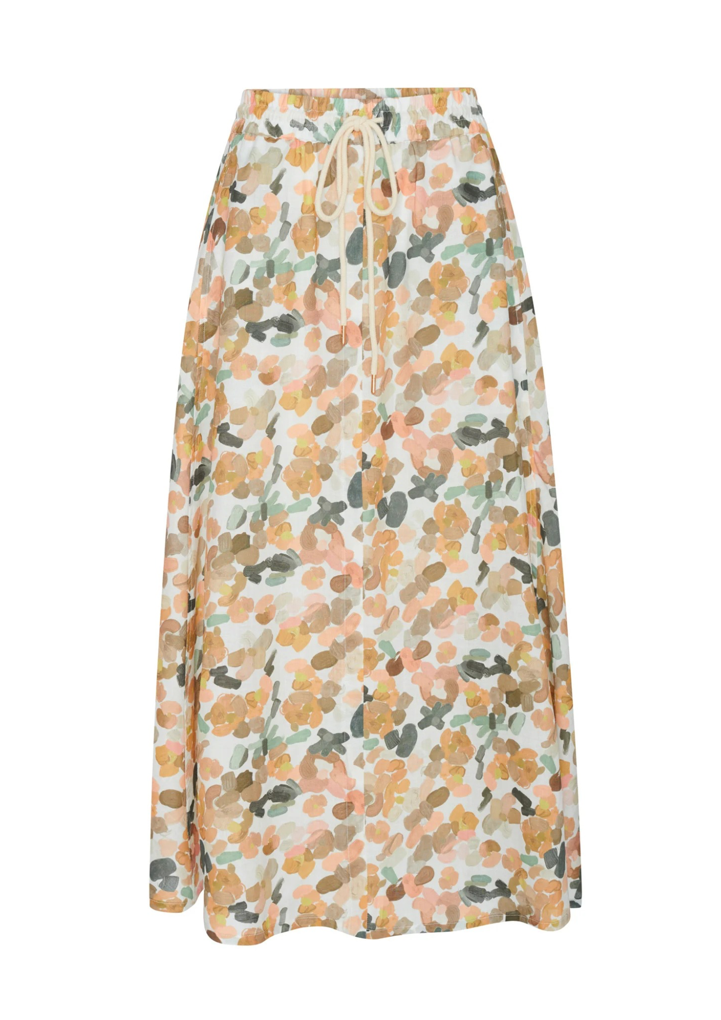Featuring a full silhouette, the Speckle Skirt features an abstract exclusive print in tones of Khaki, Ginger, Green and Pink.
