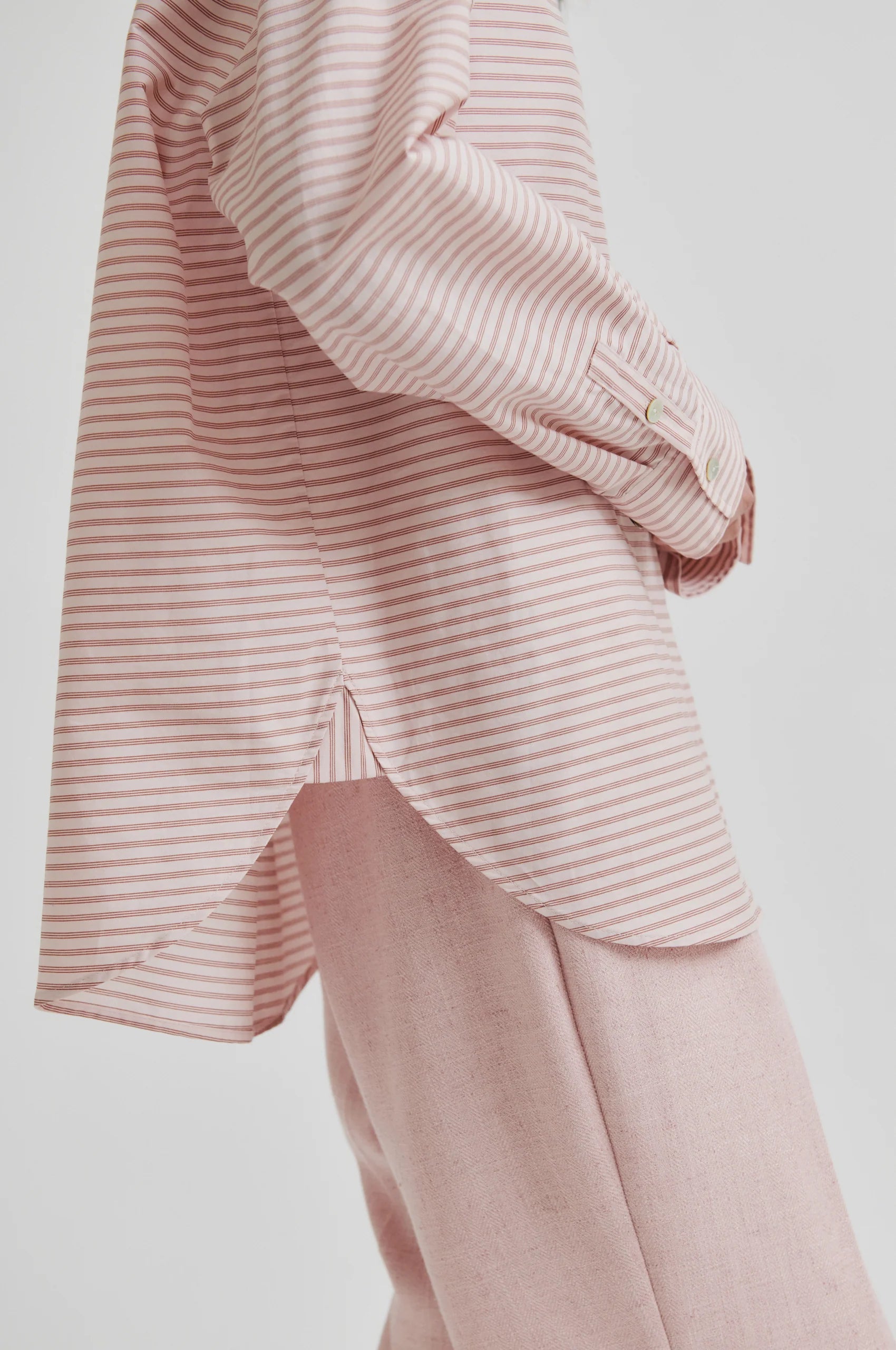 Second Female striped shirt with pocket. The shirt is made in light, smooth cotton with all-over stripes. Featuring a regular collar and placket with concealed button-through fastening at the front. Long sleeves with adjustable cuffs with button fastening. Large chest pocket. Shaped bottom hem. Loose fit.