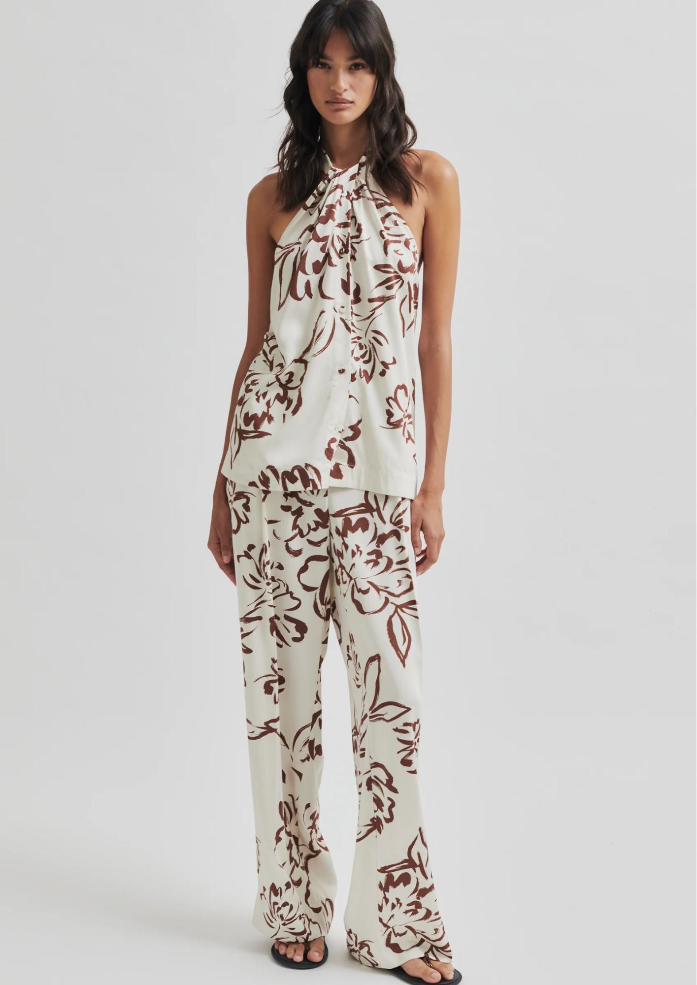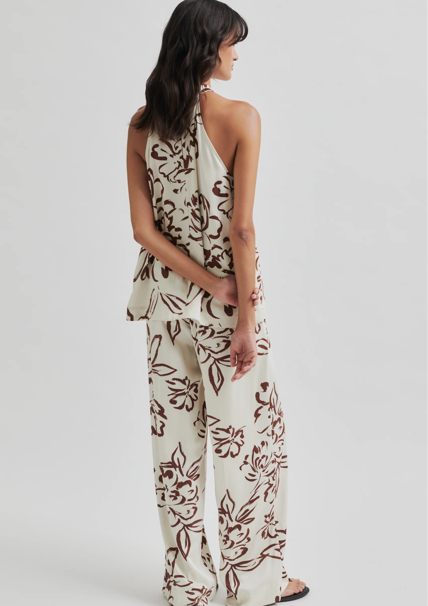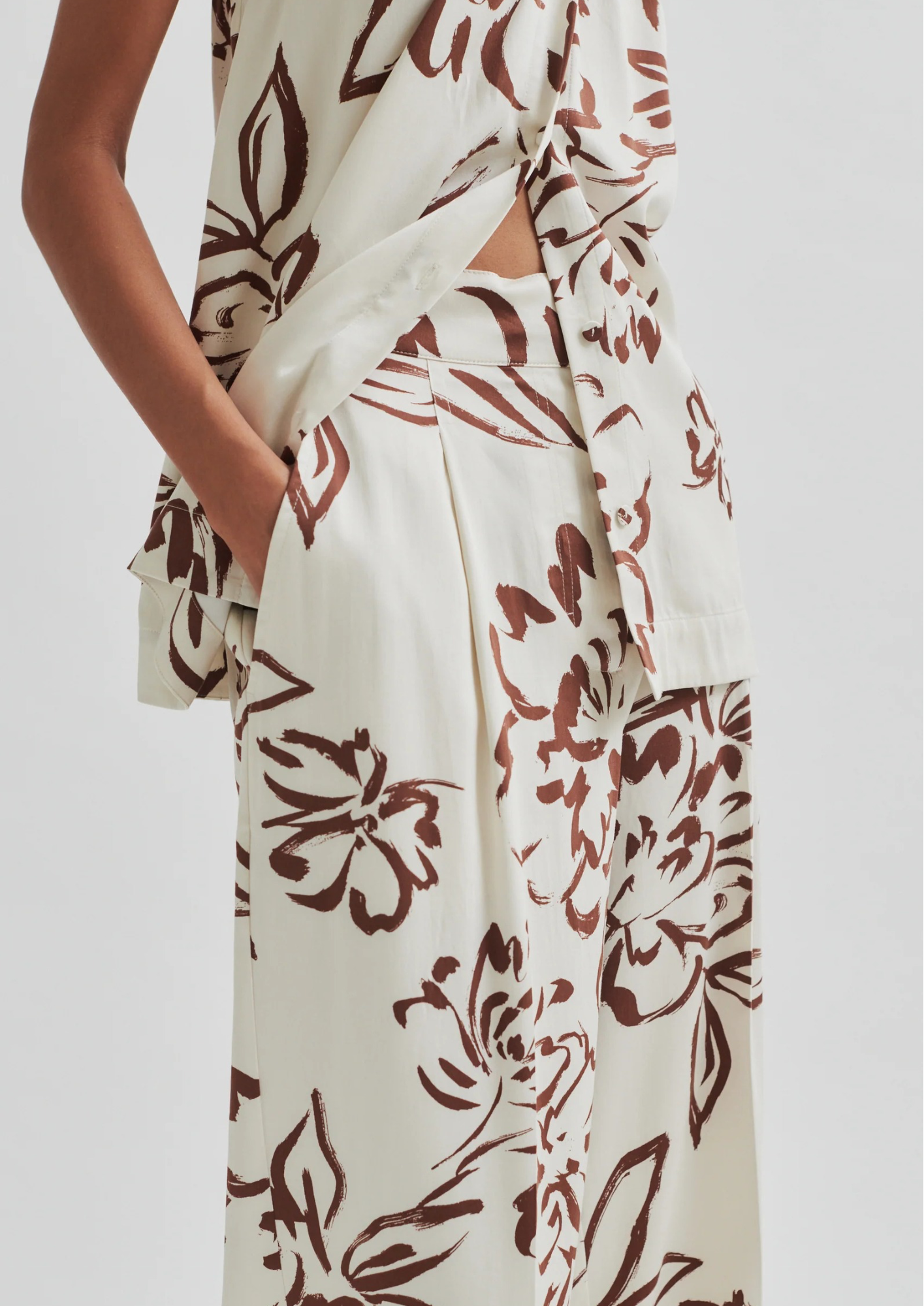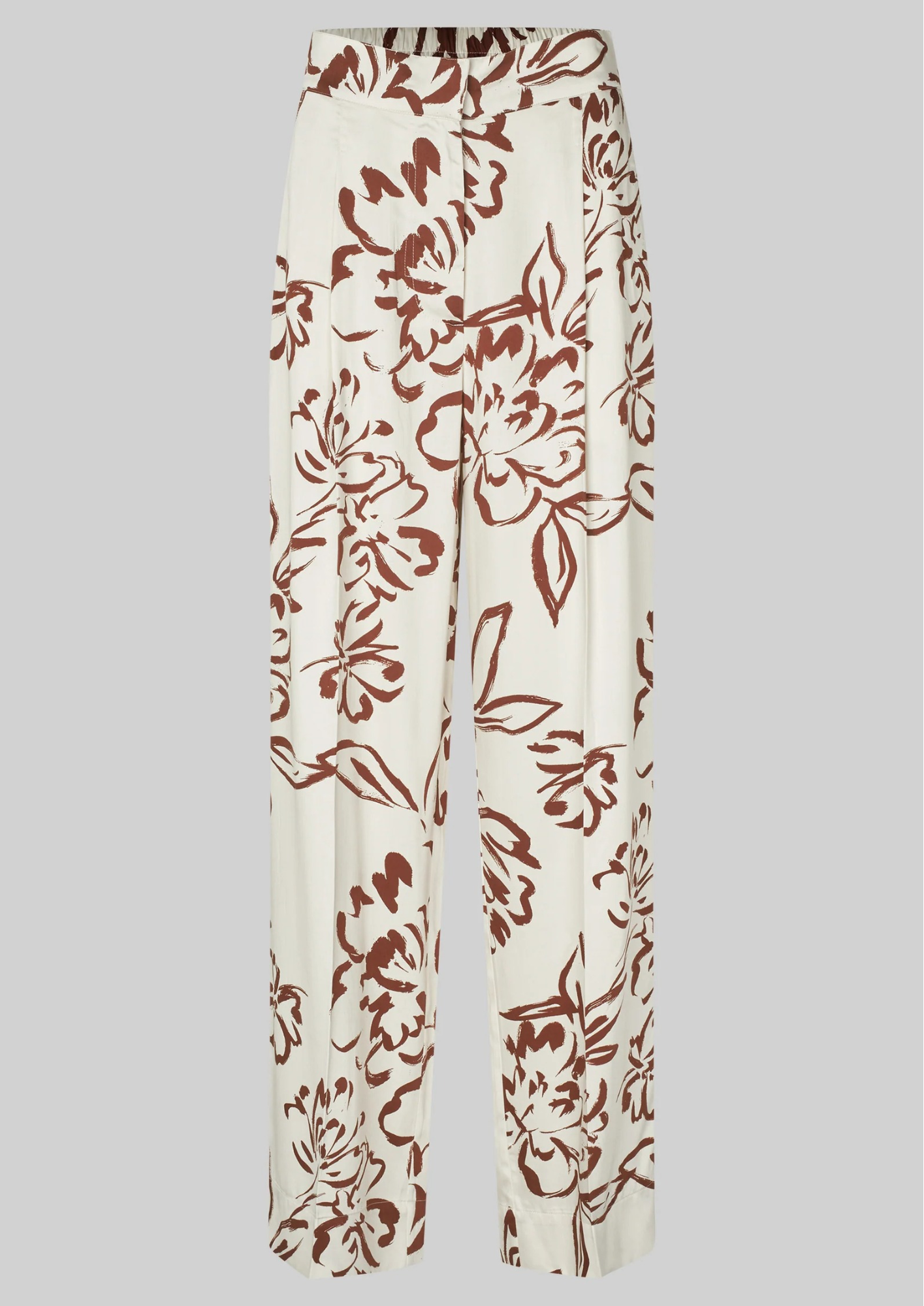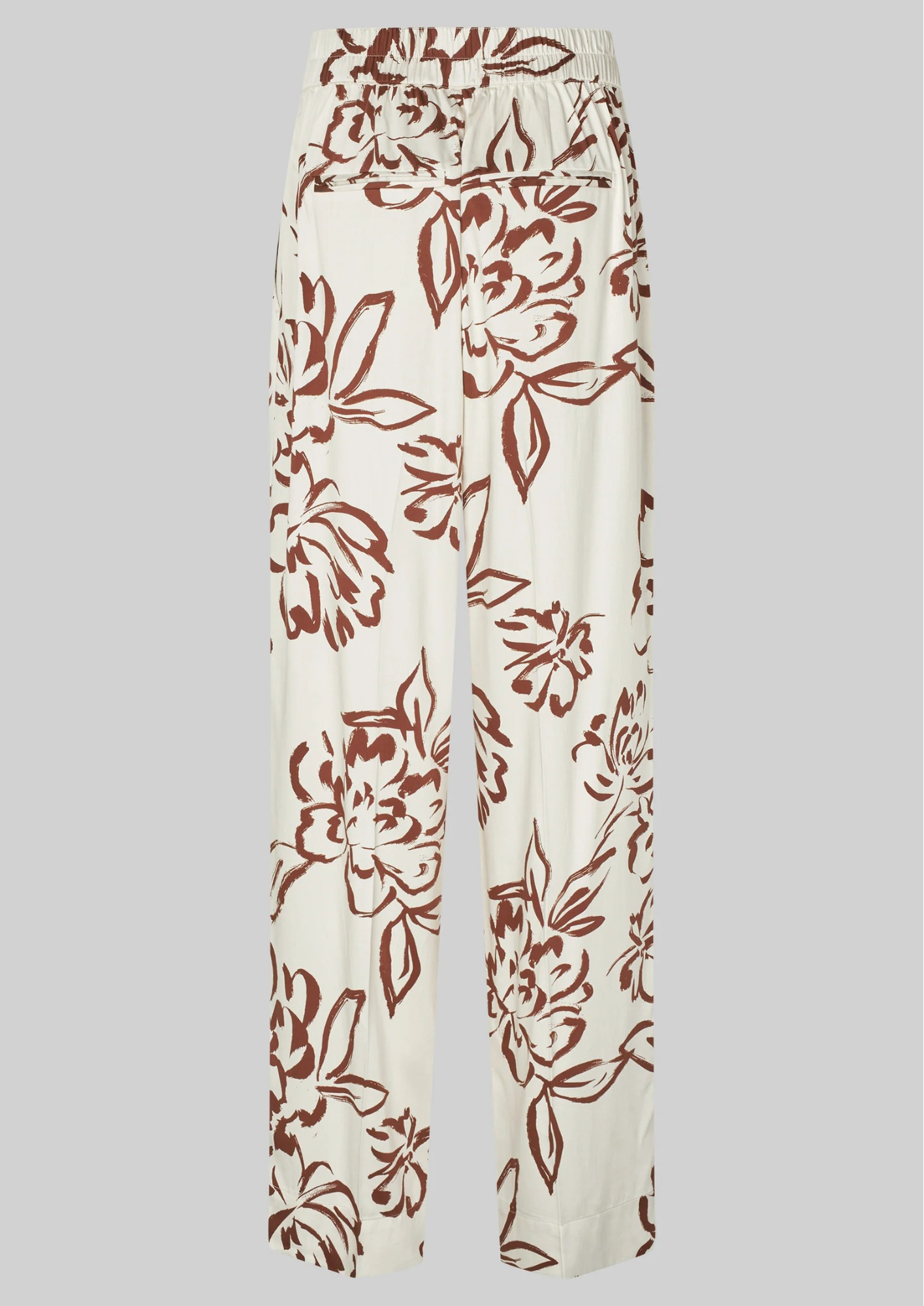 Second Female trousers with graphic print. The trousers are made in a soft and drapy viscose blend. Featuring a concealed zip, hook and button fastening at the front and elasticated section at the back. Two slanted pockets at the front and two decorative pockets at the back. Mid waist with loose fit and straight, fluid leg.