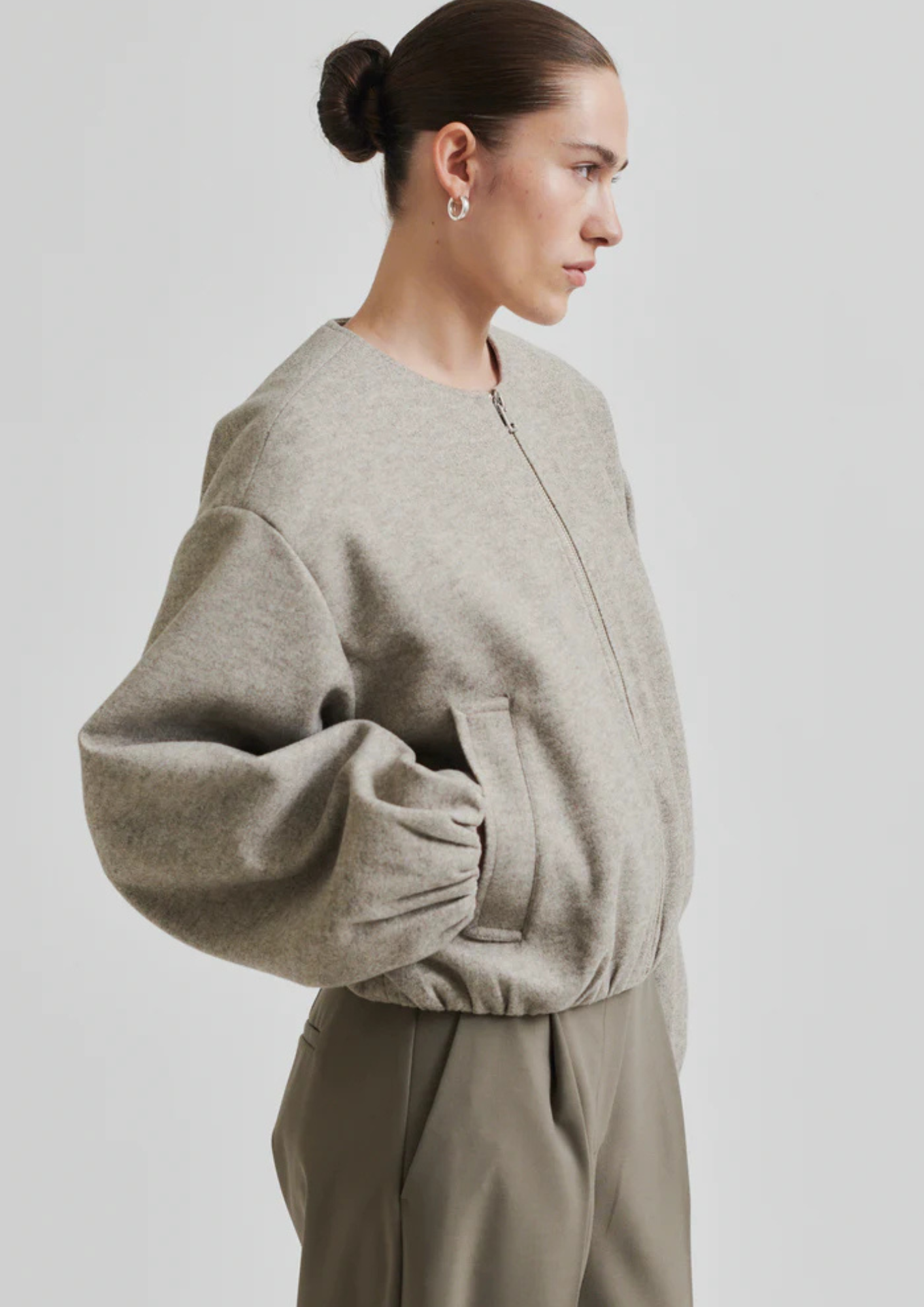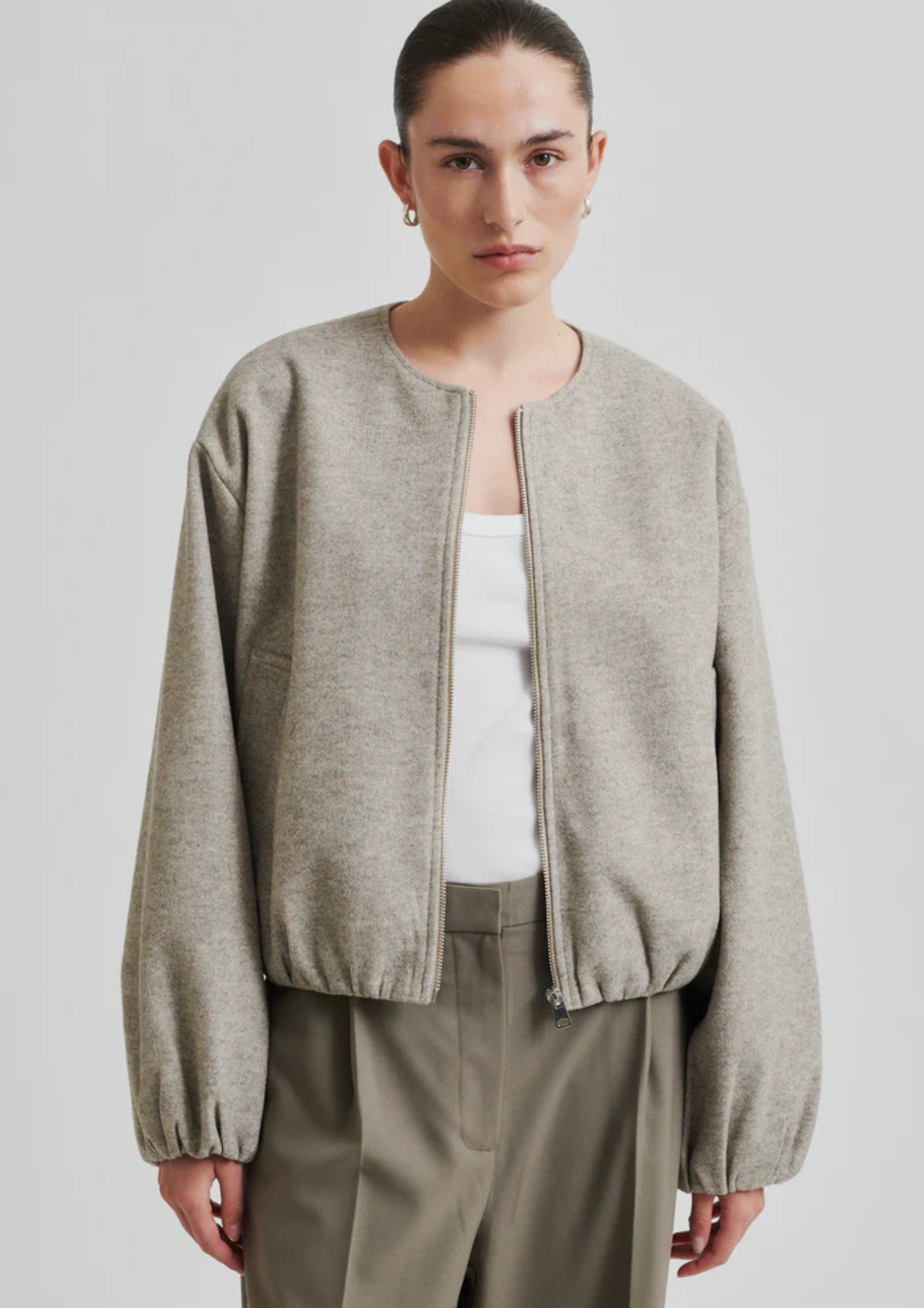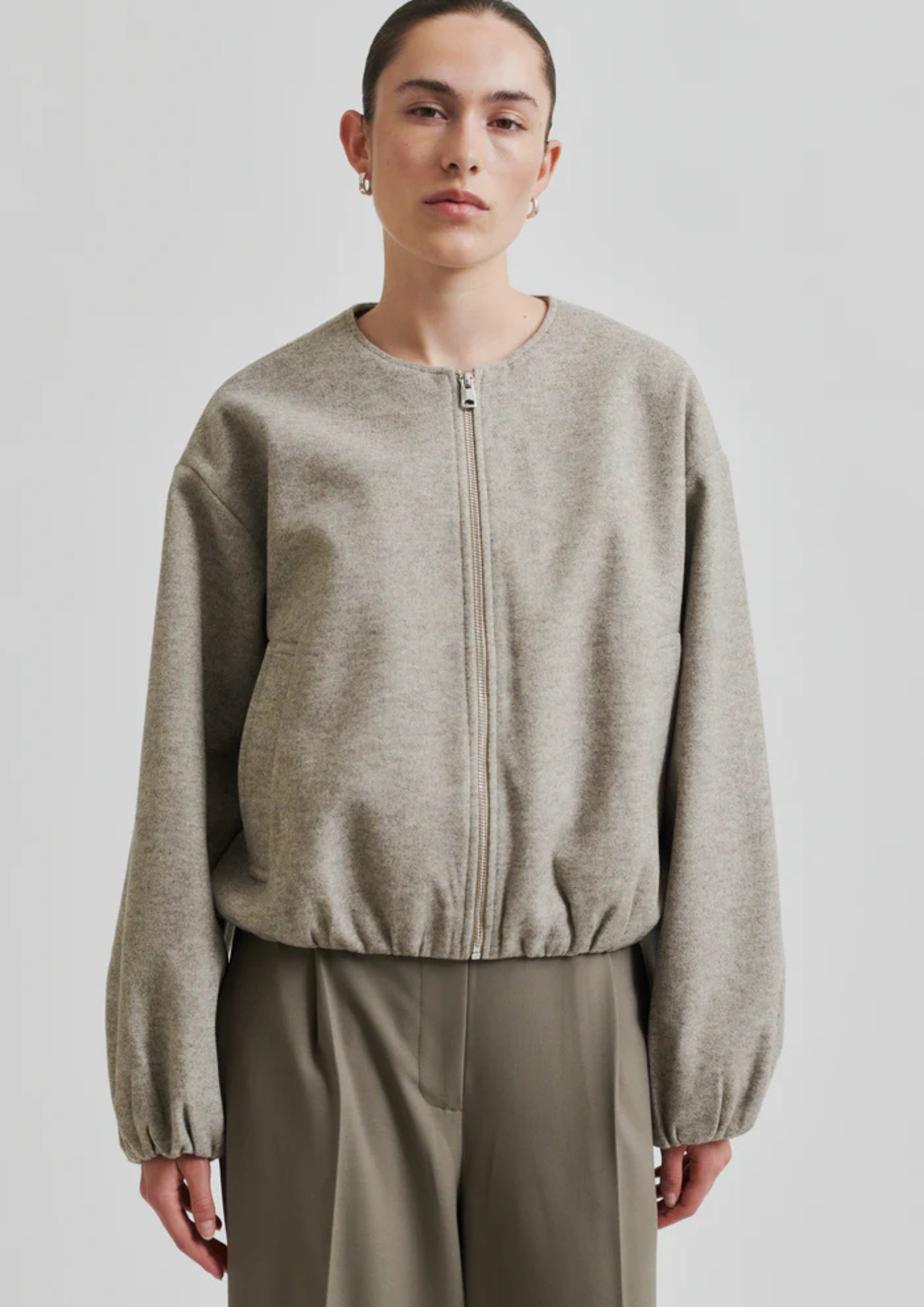 Second Female melange bomber jacket. The jacket is made in smooth, soft fabric with a melange appearance. Featuring a round neck and metal zip fastening at the front. Two side pockets and dropped shoulders with long sleeves. Elasticated cuffs and bottom hem. Fully lined. Wide, relaxed fit with fitted waist.