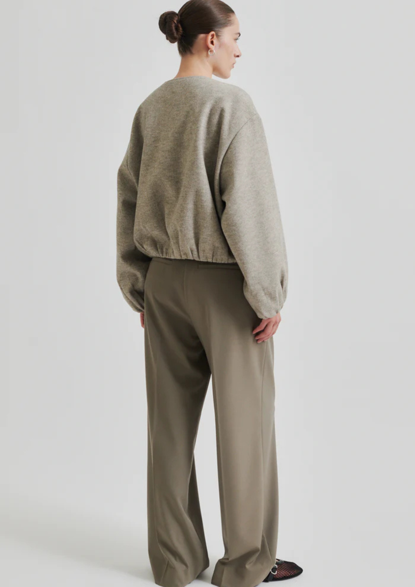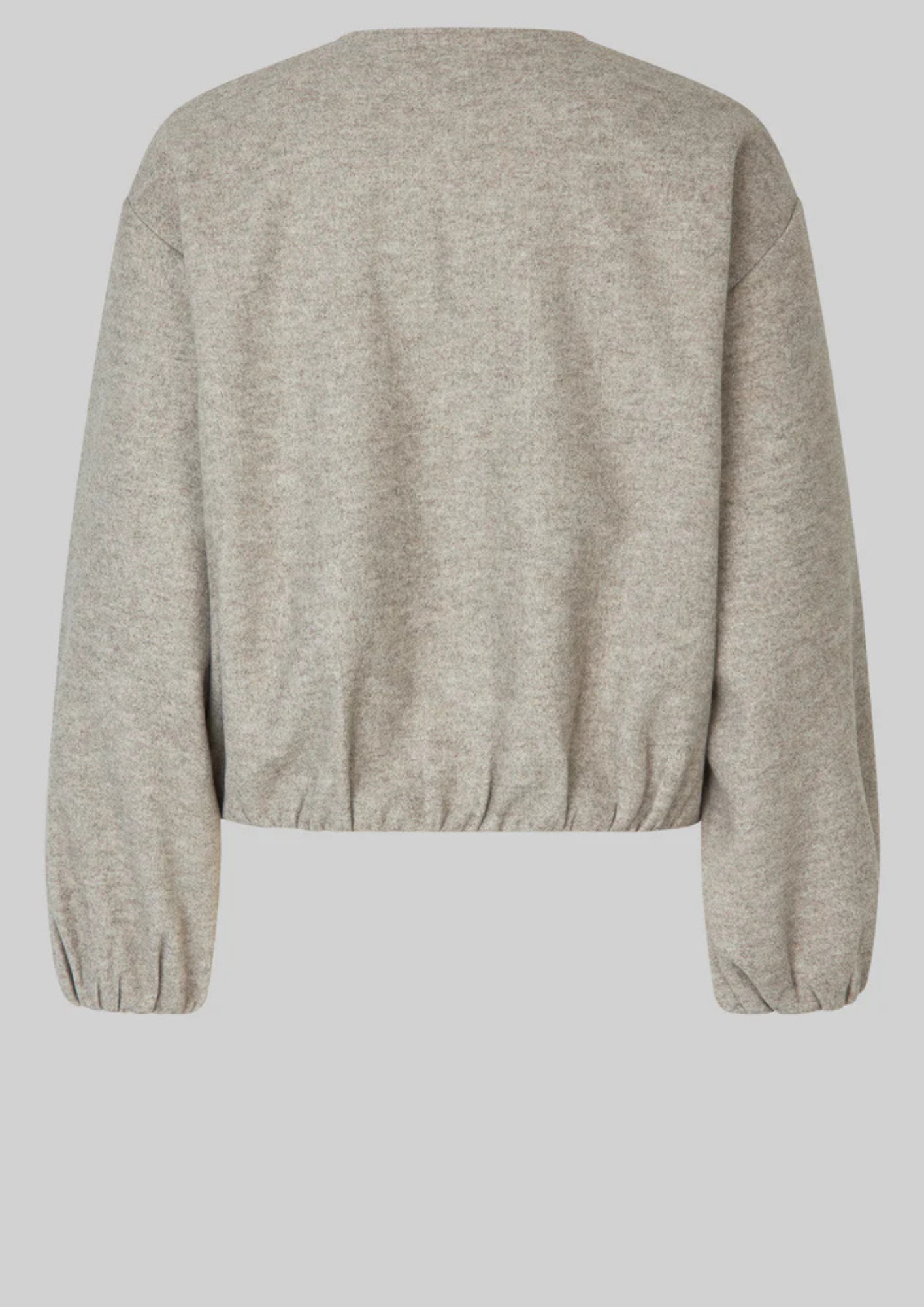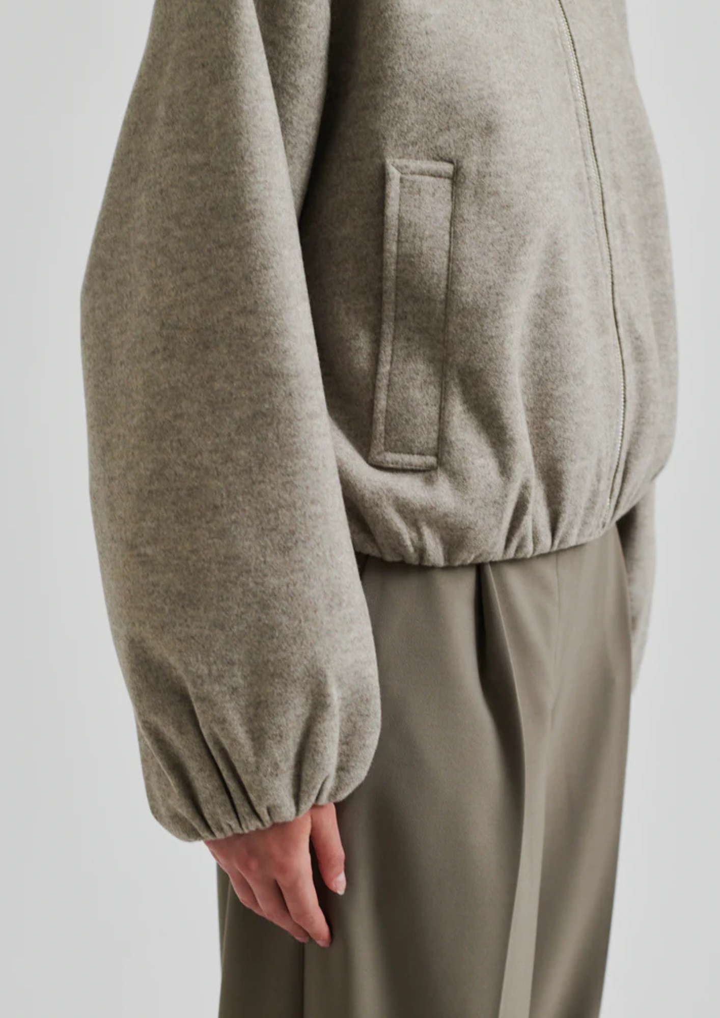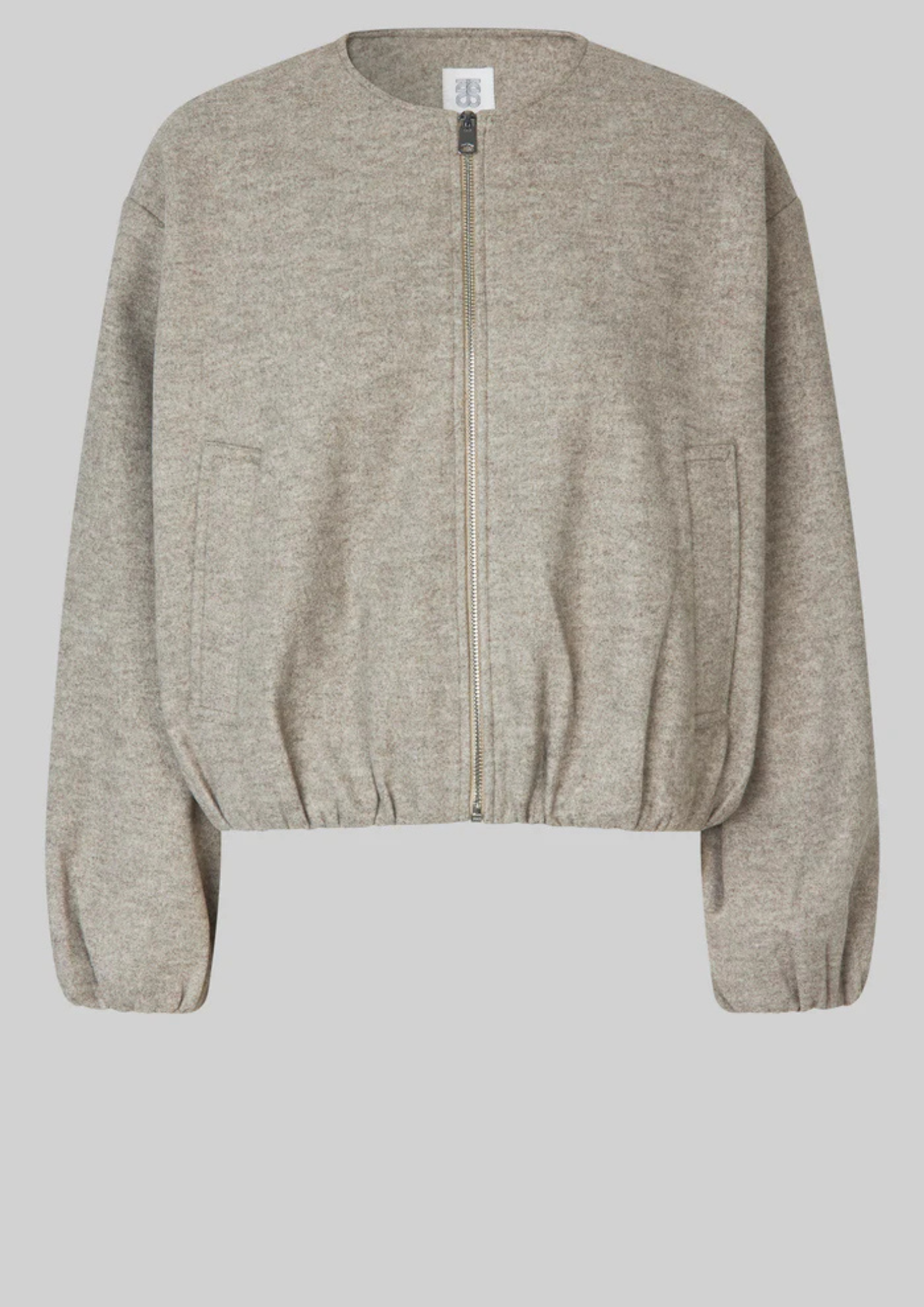 Second Female melange bomber jacket. The jacket is made in smooth, soft fabric with a melange appearance. Featuring a round neck and metal zip fastening at the front. Two side pockets and dropped shoulders with long sleeves. Elasticated cuffs and bottom hem. Fully lined. Wide, relaxed fit with fitted waist.