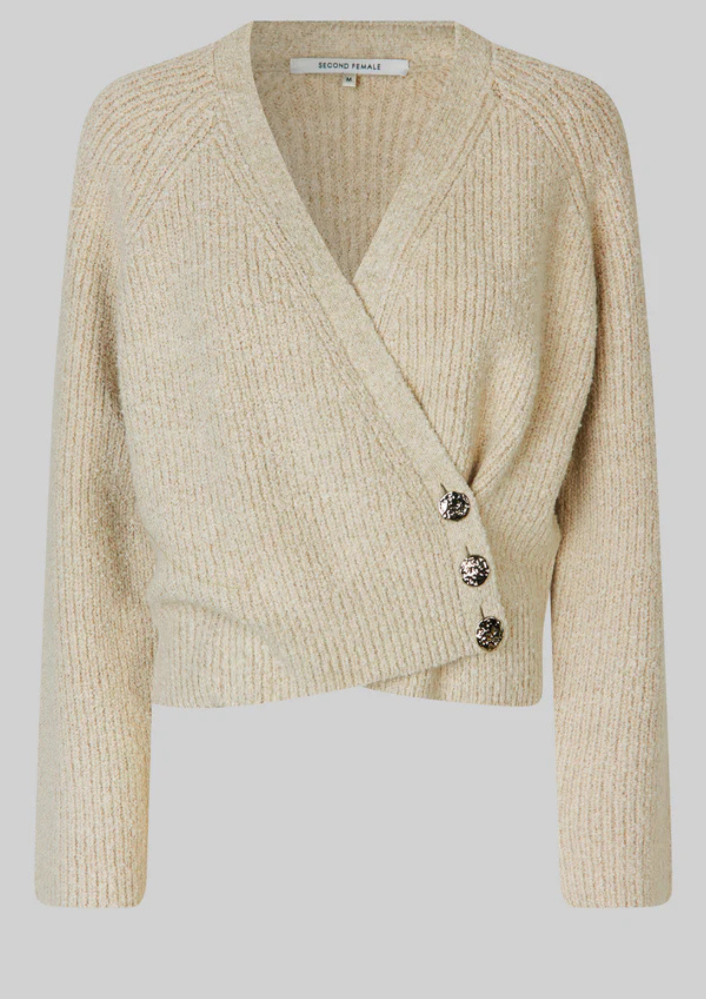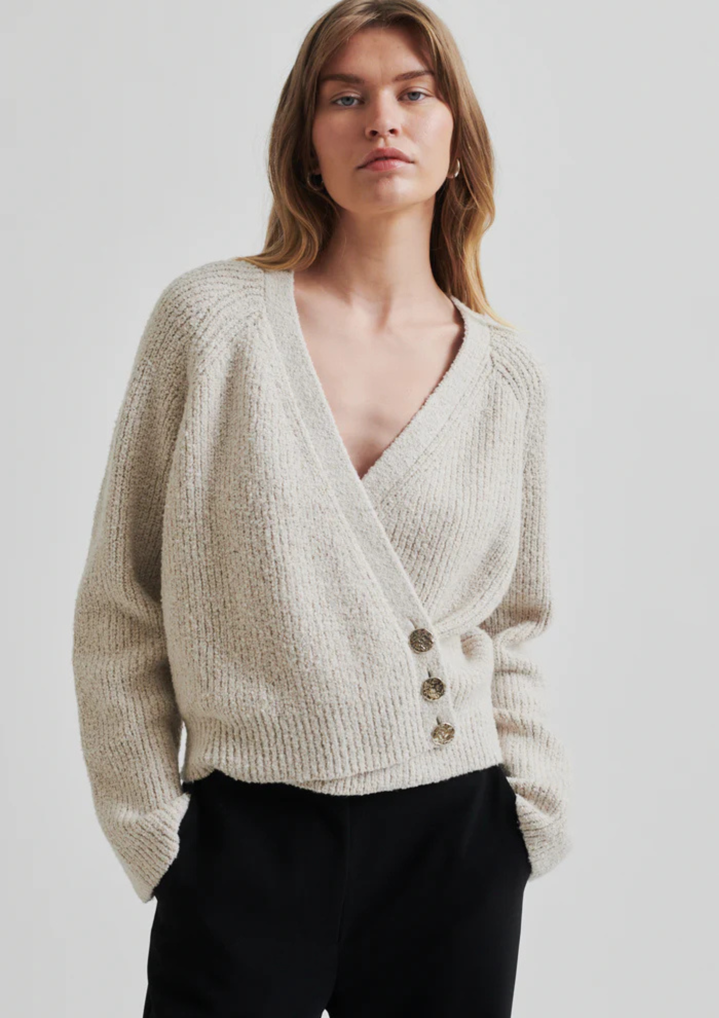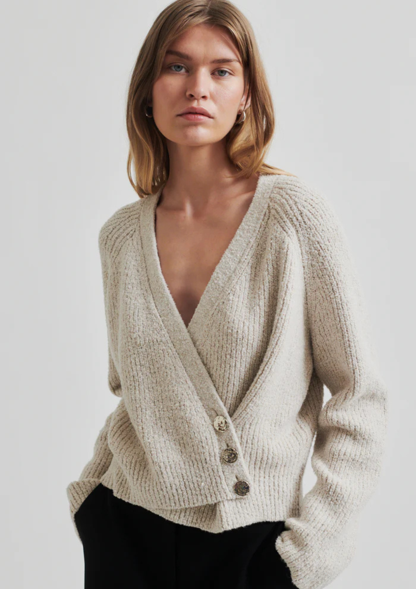 Second Female ribbed cardigan. The cardigan is made in a soft and stretchy cotton blend with melange, ribbed quality. Featuring a V-neckline with button-through asymmetric fastening at the front with silver decorative buttons. Button fastening inside that creates pleated effect. Long raglan sleeves with wide cuffs. Two front pockets with ribbed trim. Relaxed fit.