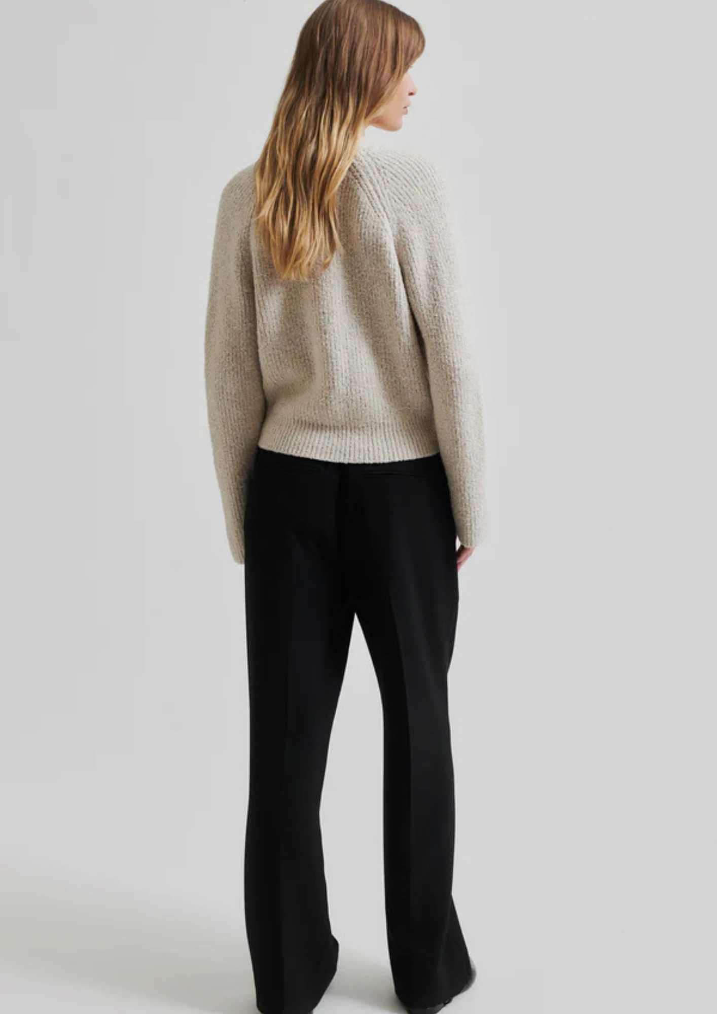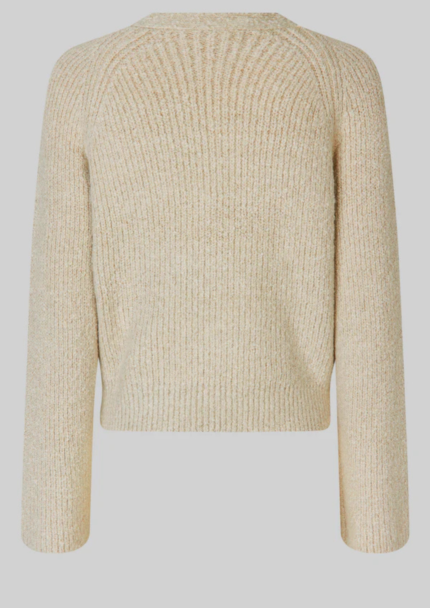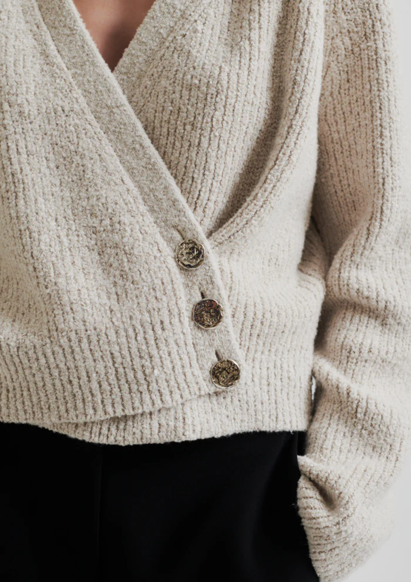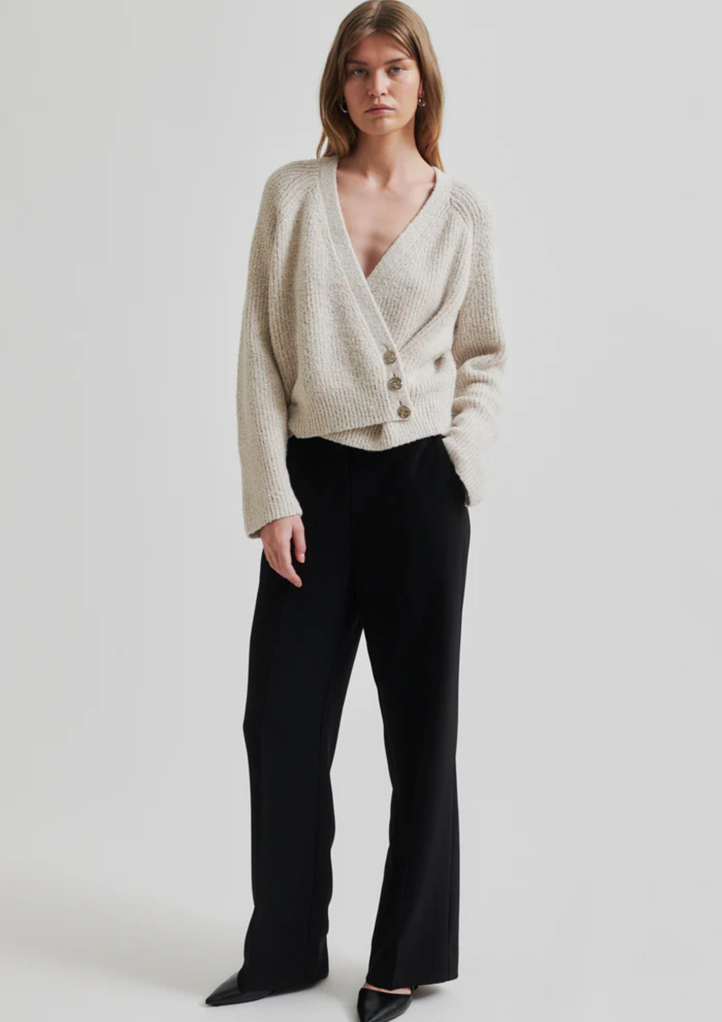 Second Female ribbed cardigan. The cardigan is made in a soft and stretchy cotton blend with melange, ribbed quality. Featuring a V-neckline with button-through asymmetric fastening at the front with silver decorative buttons. Button fastening inside that creates pleated effect. Long raglan sleeves with wide cuffs. Two front pockets with ribbed trim. Relaxed fit.